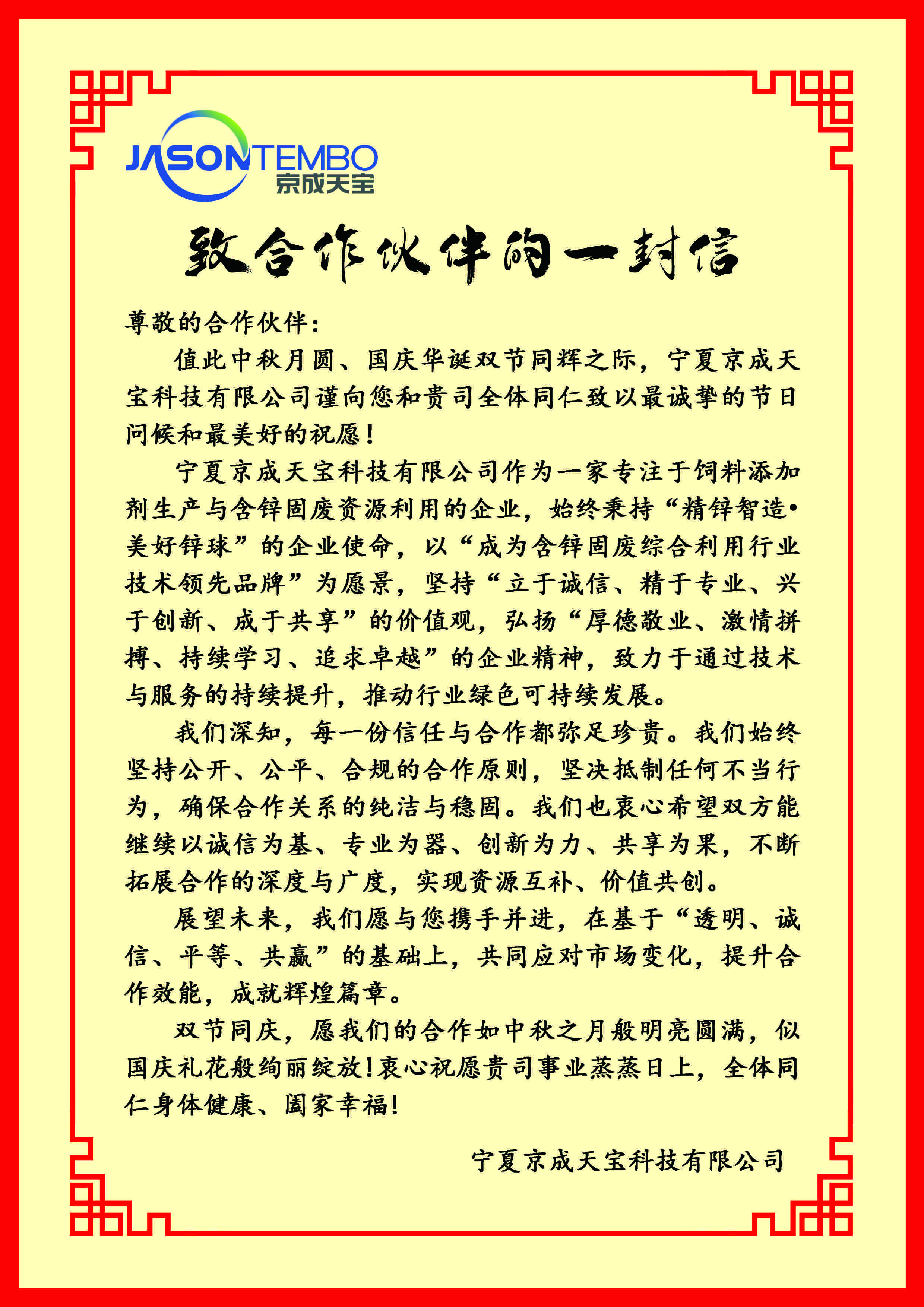 宁夏京成天宝科技有限公司是一家将含锌固废资源综合利用、绿色环保的科技型民营企业。公司创于2003年8月,并于2014年斥资四亿元在宁夏青铜峡工业园区建成年产二万吨饲料级氧化锌、四万吨硫酸锌的生产基地。公司以“规范行业、创建标杆”为初心,秉承“锌源好,锌才好”的理念,集研发、生产、服务为一体,通过科技创新、绿色循环,是国内较早实现工艺设计规范、全领域科研合作的微量元素饲料添加剂企业之一。在微量元素饲料级氧化锌产品制造平台的基础上,公司持续回收含锌固废中伴随的铟、镓、锗、锡、铜、镉等稀散金属、小金属元素,并同时具备微量元素预混合饲料、复合农用肥的生产资质和生产能力。